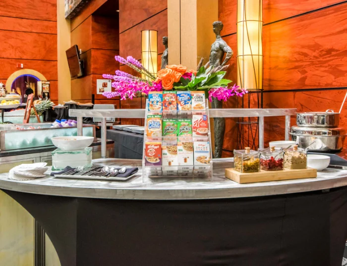 Our updated, full breakfast buffet (served Mon-Fri 6-10 am; Sat-Sun 7-11 am) offers a daily Chef’s Special, paired with an omelet station and all your favorites – from bacon, sausage, eggs, and breakfast pastries to lighter choices, including oatmeal, fruit, and yogurt parfaits. And, of course, freshly brewed coffee and tea! $19.95 per person, plus tax.